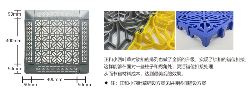 正和小四葉草采用通扣設計,可以確保產(chǎn)品鋪設完成后在任何區域單獨取出,極大的方便了客戶(hù)后期局部清理泥沙等,給店面的日常衛生維護提供了很好的基礎。