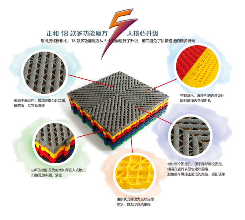 5、拼接格柵局部鋪設容易滑動(dòng),多功能魔方增加固定孔,局部鋪設可固定,更牢固;